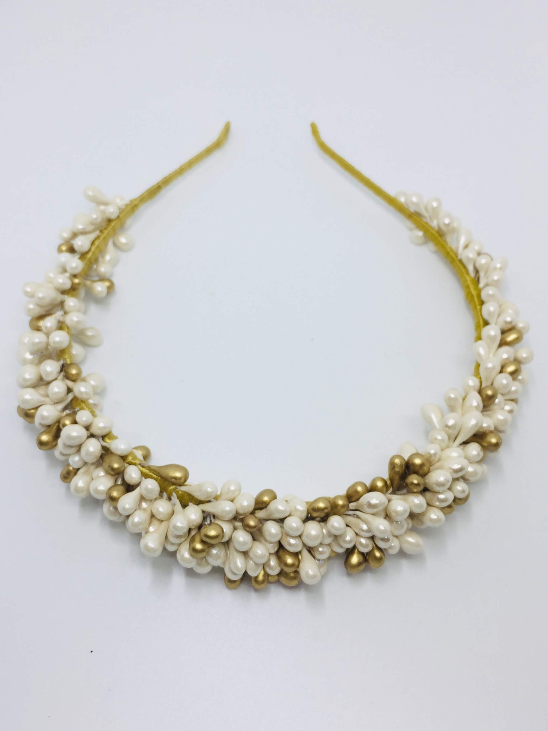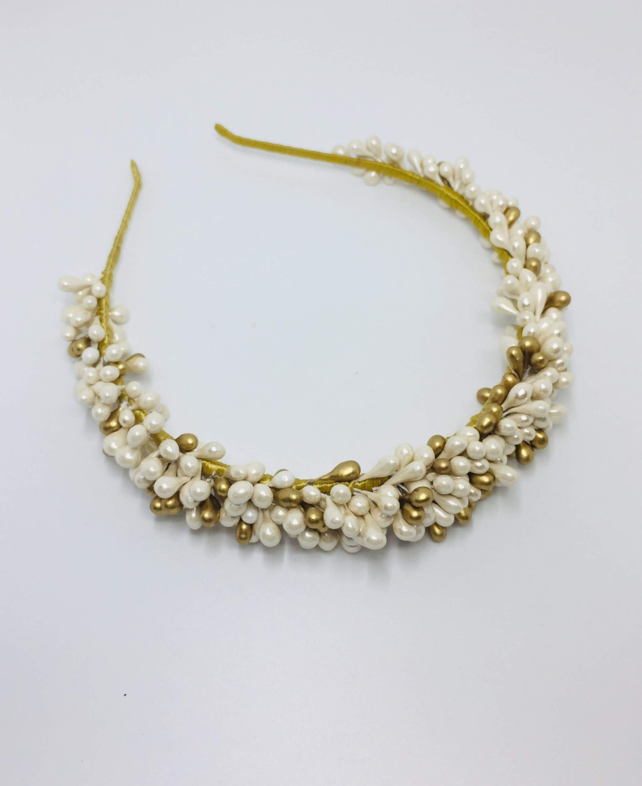 Nuestro tocado de novia Ranko, es una diadema súper elegante. En color blanco perla brillante y oro. Lo podéis llevar con casí todo tipo de peinado, es muy versátil, a nosotros, ¡nos flipa! Es una pieza fácil de llevar y que se luce muchísimo. Trabajamos este tipo de tocados de novias en nuestro taller, cada uno es hecho a mano, con mucha dedicación y cuidado. Podemos hacerlo en otros colores, y de otros tamaños. ¡Escríbenos!